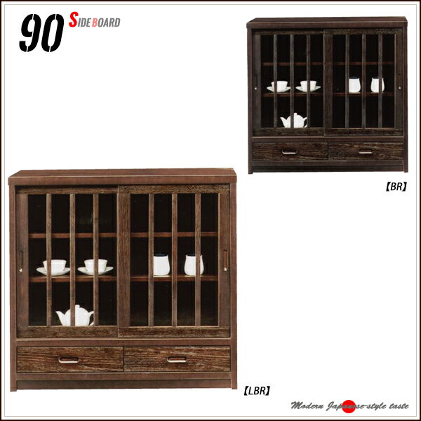 サイドボード 格子 日本製 キャビネット 90 グラス収納 うづくり仕上げ ガラス扉 電話台 大川家具 無垢 ファックス台 引き戸 スライド式 fax台 【送料無料】(北海道・東北・沖縄・離島は別途見積)