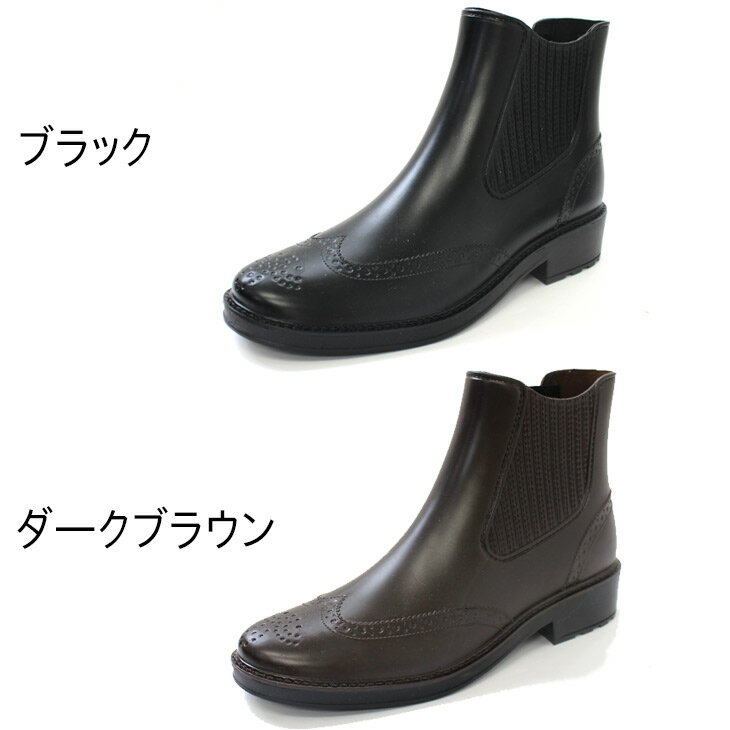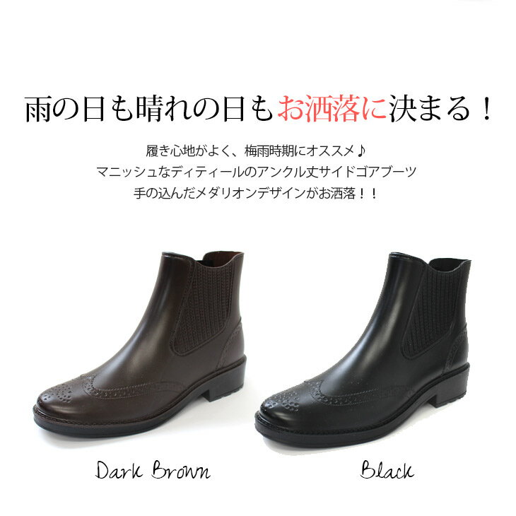 サイドゴアレインショートブーツ 3.5センチヒール レディース ブラック ブラウン 雨晴れ兼用 長靴 アウトドア ウイングチップ ラバー ローヒール 痛くない 歩きやすい